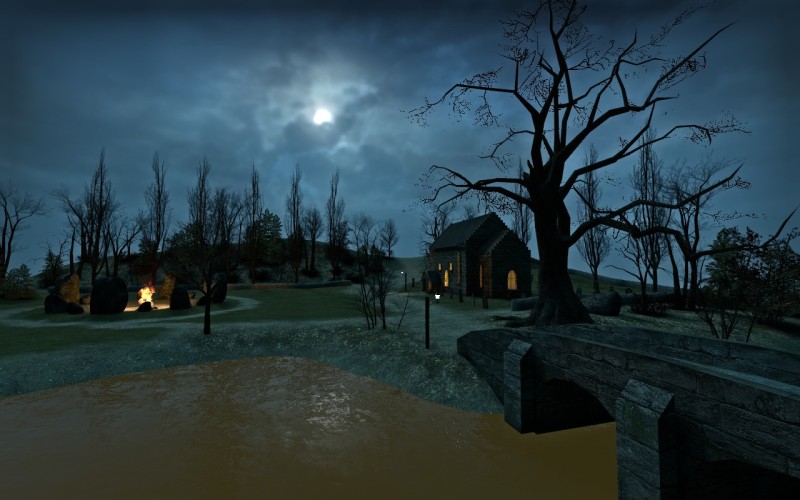I've moved the stone circle in towards the church quite a bit.  In the first shot you can see that it has moved in from the left of frame.  Also moved the bridge lamp to the other side of the road and made a few other minor lighting changes.  Now for some more work on the far side of the bridge...